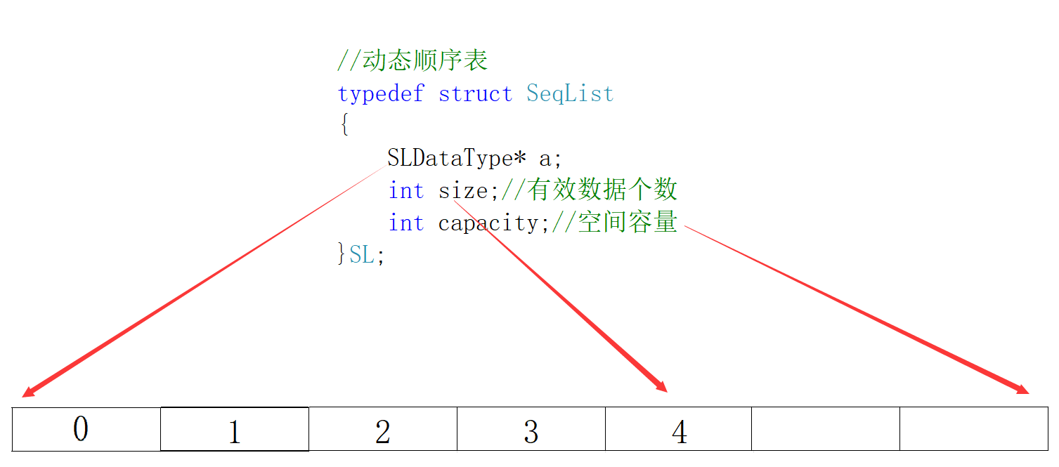 其中size是记录多少个有效数据,为什么要定义这个capacity呢?因为是动态的顺序表,今天100的空间,明天200的空间,所以就是capacity空间有多大,空间容量