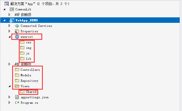 在Web_DEMO下面新建Controllers、Models、Repository、Views、wwwroot 共5个文件夹;