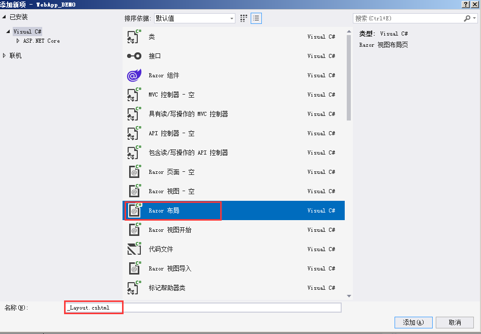 类型选择“Razor视图-空”,添加”Razor布局“,文件名系统默认:_Layout.cshtml