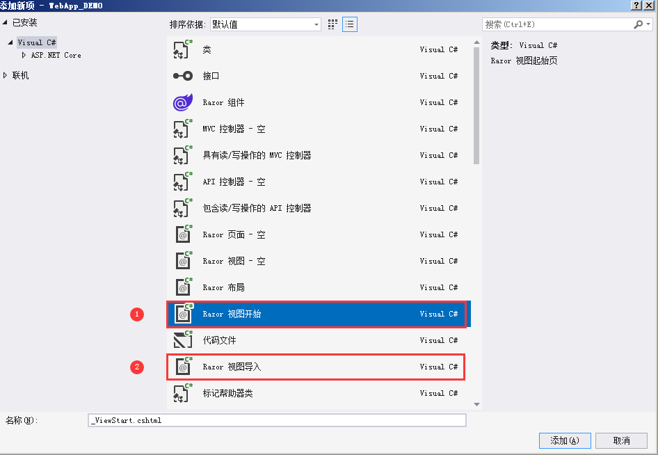 依次添加“Razor视图开始”和“Razor视图导入”,文件名系统默认:_ViewStart.cshtml、_ViewImports.cshtml
