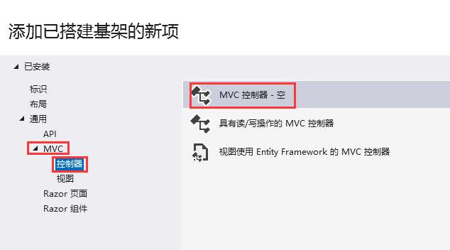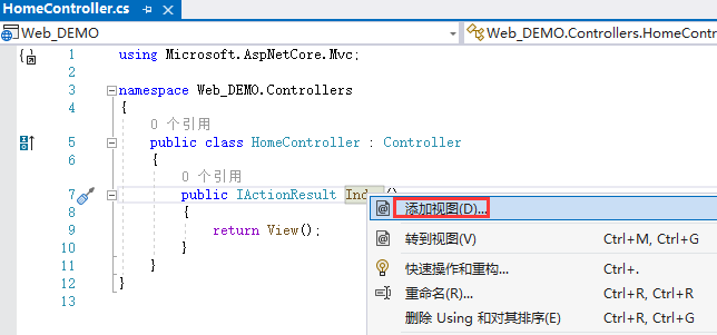 Controllers文件夹下,右键添加控制器,选择空控制器,命名:HomeController.cs