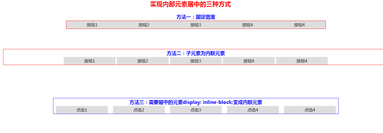 <!doctype html> <html lang="en"> <head> <meta charset="UTF-8"> <meta name="viewport" content="width=device-width, user-scalable=no, initial-scale=1.0, maximum-scale=1.0, minimum-scale=1.0"> <meta http-equiv="X-UA-Compatible" content="ie=edge"> <title>实现内部元素居中的三种方式</title> <style> *{margin: 0; padding: 0;} h2{text-align: center; color: red;} h3{text-align: center; color: blue;} .clearfix:after{content: '';clear: both; display: block; overflow: hidden; height: 0;} /*方法一:传统方法通过固定宽度width: 1000px;和margin: 0 auto;来实现居中, *弊端:1.需要精确计算出box的宽度, * 2.当内部子元素需要增加或者减少的时候,这个宽度需要重新计算,比较麻烦。 * 3.需要使用clear来清除浮动,解决因浮动产生的外部元素无法获取高度的尴尬问题。 */ .box-wrap0{position: relative; width: 100%; height: 100px; text-align: center; padding: 20px; line-height: 30px;} .box-wrap0 .box{position: relative; width: 1000px; margin: 0 auto; border: red 1px solid;} .box-wrap0 .box-item{width: 200px; float: left; background: #dedede;} /* *方法二:1.最里面的元素使用内联元素布局,2.外部元素使用margin: 0 auto; 可以轻松实现居中对齐 */ .box-wrap1{position: relative; width: 100%; height: 100px; padding: 20px; text-align: center; line-height: 30px;} .box-wrap1 .box{position: relative; margin: 0 auto; border: red 1px solid;} .box-wrap1 .box-item{width: 200px; display: inline-block; background: #dedede;} /*内部元素为内联元素*/ /* *方法三:1.最外部元素使用text-align: center; 2.给需要居中的元素display: inline-block;变成内联元素 3.给需要居中的元素float: left;,可以轻松实现居中对齐 *优势:当内部元素需要增加或者减少时,仍然会自动居中 */ .box-wrap2{position: relative; width: 100%; text-align: center; margin-top: 50px; padding: 20px; line-height: 30px;} /* 内容居中显示:text-align: center;*/ .box-wrap2 .box{position: relative; display: inline-block; border: blue 1px solid;} /*需要居中的元素为内联元素*/ .box-wrap2 .box-item{width: 200px; float: left; margin: 0 10px; background: #dedede;} </style> </head> <body> <h2>实现内部元素居中的三种方式</h2> <div class="box-wrap0"> <h3>方法一:固定宽度</h3> <div class="box clearfix"> <div class="box-item">按钮1</div> <div class="box-item">按钮2</div> <div class="box-item">按钮3</div> <div class="box-item">按钮4</div> <div class="box-item">按钮4</div> </div> </div> <div class="box-wrap1"> <div class="box"> <h3>方法二:子元素为内联元素</h3> <div class="box-item">按钮1</div> <div class="box-item">按钮2</div> <div class="box-item">按钮3</div> <div class="box-item">按钮4</div> <div class="box-item">按钮4</div> </div> </div> <div class="box-wrap2"> <div class="box"> <h3>方法三:需要居中的元素display: inline-block;变成内联元素</h3> <div class="box-item">点击1</div> <div class="box-item">点击2</div> <div class="box-item">点击3</div> <div class="box-item">点击4</div> <div class="box-item">点击4</div> </div> </div> </body> </html>
