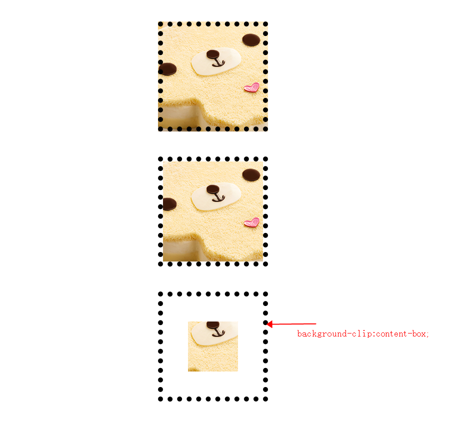 <!doctype html> <html lang="en"> <head> <meta charset="UTF-8"> <title>扩大热点区域的方法,不支持iee8</title> <style type="text/css"> .test{width: 100px; height: 100px; border:10px dotted #000000; margin: 50px auto; padding:50px; } .t1{background: url("images/cake.png") center; background-clip:border-box;} .t2{background: url("images/cake.png") center; background-clip:padding-box;} .t3{background: url("images/cake.png") center; background-clip:content-box;} </style> </head> <body> <div class="test t1"></div> <div class="test t2"></div> <div class="test t3"></div> </body> </html>