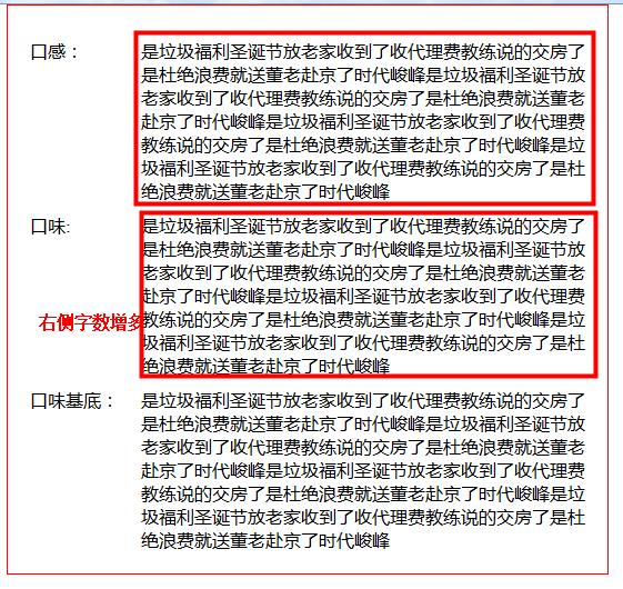 <!doctype html> <html lang="en"> <head> <meta charset="UTF-8"> <title>mcake-详情页-口味布局</title> <style type="text/css"> *{margin: 0; padding: 0;} .clearfix:after { clear: both; content: "."; display: block; height: 0; visibility: hidden; } .box{width: 500px; border: red 1px solid; margin: 0 auto; padding: 20px;} .box .f-left{float: left; display: block; width: 100px;} .box .f-right{ display: block; margin-left:100px; *margin-left:107px;} .box p{margin: 10px 0;} </style> </head> <body> <div class="box clearfix"> <p> <span class="f-left">口感:</span> <span class="f-right">是垃圾福利圣诞节放老家收到了收代理费教练说的交房了是杜绝浪费就送董老赴京了时代峻峰是垃圾福利圣诞节放老家收到了收代理费教练说的交房了是杜绝浪费就送董老赴京了时代峻峰是垃圾福利圣诞节放老家收到了收代理费教练说的交房了是杜绝浪费就送董老赴京了时代峻峰是垃圾福利圣诞节放老家收到了收代理费教练说的交房了是杜绝浪费就送董老赴京了时代峻峰</span> </p> <p> <span class="f-left">口味:</span> <span class="f-right">是垃圾福利圣诞节放老家收到了收代理费教练说的交房了是杜绝浪费就送董老赴京了时代峻峰是垃圾福利圣诞节放老家收到了收代理费教练说的交房了是杜绝浪费就送董老赴京了时代峻峰是垃圾福利圣诞节放老家收到了收代理费教练说的交房了是杜绝浪费就送董老赴京了时代峻峰是垃圾福利圣诞节放老家收到了收代理费教练说的交房了是杜绝浪费就送董老赴京了时代峻峰</span> </p> <div> <span class="f-left">口味基底:</span> <span class="f-right">是垃圾福利圣诞节放老家收到了收代理费教练说的交房了是杜绝浪费就送董老赴京了时代峻峰是垃圾福利圣诞节放老家收到了收代理费教练说的交房了是杜绝浪费就送董老赴京了时代峻峰是垃圾福利圣诞节放老家收到了收代理费教练说的交房了是杜绝浪费就送董老赴京了时代峻峰是垃圾福利圣诞节放老家收到了收代理费教练说的交房了是杜绝浪费就送董老赴京了时代峻峰</span> </div> </div> </body> </html>