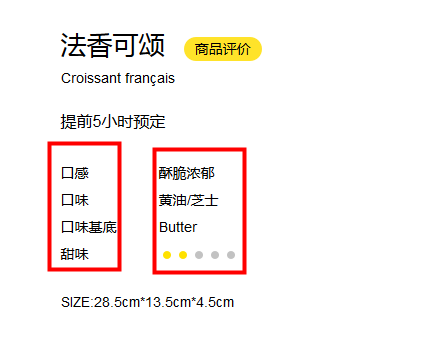 常用布局:左侧一栏为标题,右侧一栏为内容,右侧的内容可以增加,不会向左偏移。 cake-详情页-口味布局