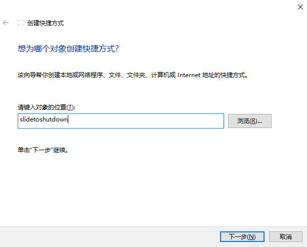 如果觉得每次都要输入代码很麻烦,那我们桌面右键,新建一个快捷方式,在对象位置输入【slidetoshutdown】。