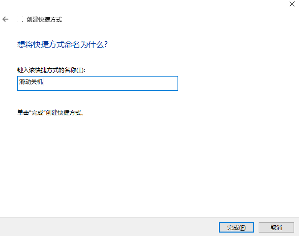 点击下一步,给这个快捷方式取一个名字即可,比如我这里取“滑动关机”