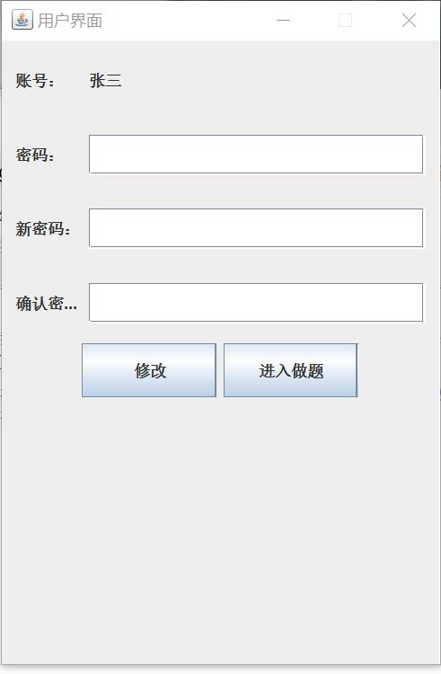当注册或者登入成功后会进入到用户界面(UserUI),可以选择修改密码和进入做题,如果输入密码和新密码后,按下修改或者进入做题都会进入到题目选择界面,但是按下修改需要返回进行确认修改。