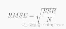 上图中的SSE指sum of squared error,也即预测值与实际值之差的平方和,可由此判断该模型的误差。但使用SSE表征模型的误差有些弊端,比如它依赖于点的个数,且不好定其单位。所以我们有另外一个值去称量模型的误差。RMSE(Root-Mean-Square Error)。