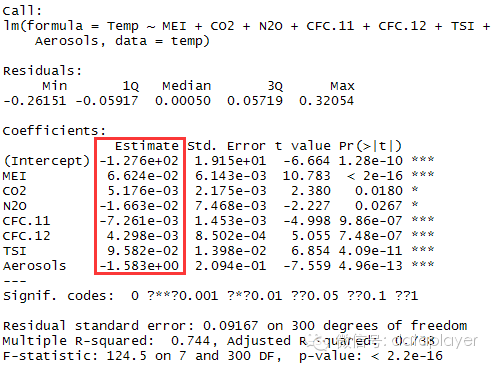 本轮得到Temp ~ MEI + CO2 + N2O + CFC.11 + CFC.12 + TSI + Aerosols