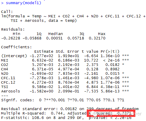 model1 <- lm(Temp ~ MEI + CO2 + CH4 + N2O + CFC.11 + CFC.12 + TSI + Aerosols, temp) summary(model1)