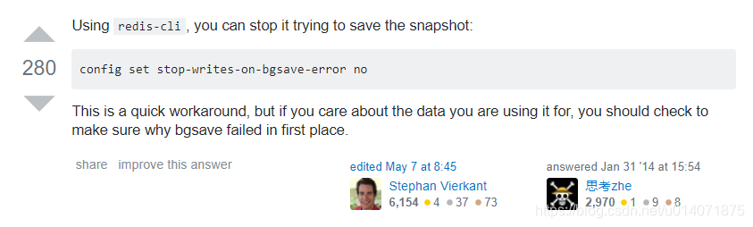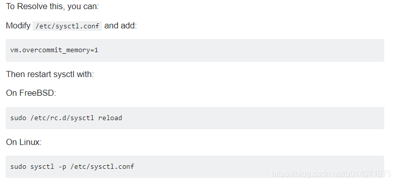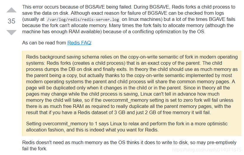 大概意思是(翻译不到位的地方,还请见谅,英文比较菜):在BGSAVE时,Redis会fork一个子进程,把数据保存到硬盘上。你可以通过查看日志来获取BGSAVE失败的原因(Linux系统里Redis日志文件通常是在/var/log/redis/redis-server.log),大多数时候BGSAVE失败的原因是fork进程分配不到内存。更多时候,fork进程分配不到内存是因为跟操作系统的优化相冲突,即使操作系统有足够的内存。(下面一大段就不翻译了,意思是可以Redis官网找到相应的解释,文末会把相关文章链接都缀上)。当然大神也给出了解决方案