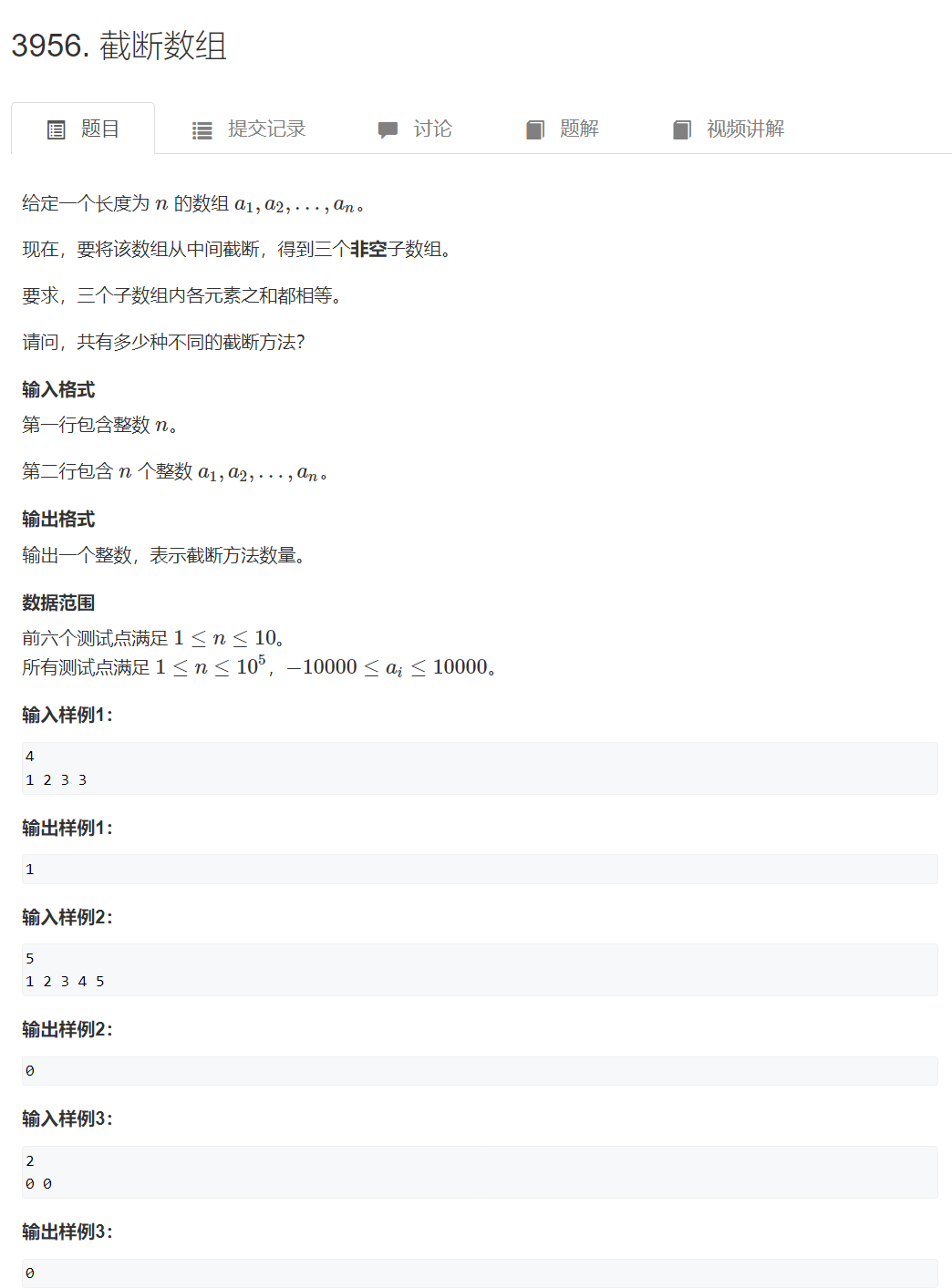 #include<iostream> using namespace std; const int N = 1e5+5; int n,s[N],temp,cnt=0; long long ans=0; int main() { cin>>n; for (int i = 1; i <= n; i++)//i初始值为1而非0 { scanf("%d",&temp); s[i]=s[i-1]+temp; } if (s[n]%3 || n < 3 ){//特判(特殊情况判断):当n小于3(第二刀无处切)或者总和不是3的倍数时,方案数为0 puts("0"); } else{ for (int i = 2; i < n; i++)//只遍历一遍,而非双for循环(缩小时间复杂度) | i从2开始,范围是[2,n),换言之,第二刀的位置应该从第二棵树和第三棵树的间隙开始讨论(植树问题模型) { //i遍历的是第二刀(第二个切割点) if (s[i-1]==s[n]/3) //i-1是用来找第一刀的位置,累加第一刀可行的位置数 { cnt++; } if (s[i]==s[n]/3*2) // i用来累计第二刀的位置数 { ans+=cnt;//比如已经累计有3个可行的第一刀位置,那么每找到一个可行的第二刀位置,总方案数就是先前的方案数+可行的第一刀位置数 } } cout<<ans; } return 0; }