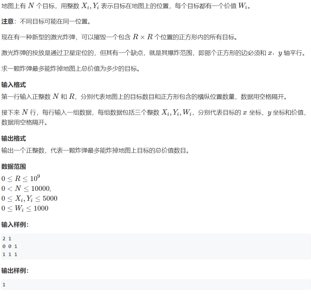 1 // 二维前缀和 2 #include <iostream> 3 #include <cmath> 4 using namespace std; 5 const int N = 5e3 + 10; 6 int n, a[N][N], r, SUM = 0; 7 int main() 8 { 9 cin >> n >> r; 10 int x, y, w; 11 int x_max = r, y_max = r; // 必须初始化为r 若初始化为0,则建立前缀和数组时无法进入循环(line:36) 12 for (int i = 0; i < n; i++) 13 { 14 scanf("%d%d%d", &x, &y, &w); 15 x++, y++; // 激光边界的正方形不会爆炸 16 a[x][y] += w; 17 SUM += w;//(line:24) 18 x_max = max(x_max, x); 19 y_max = max(y_max, y); 20 } 21 22 if (r > 5000)//数据加强过,需要加个特判:当激光"口径"大于坐标平面范围(0<=x,y<=5000)时,总的毁灭价值为SUM 23 { 24 cout << SUM << endl; 25 return 0; 26 }else{ 27 for (int i = 1; i <= x_max; i++) // 在a数组上直接建立前缀和数组 28 { 29 for (int j = 1; j <= y_max; j++) 30 { 31 a[i][j] += a[i - 1][j] + a[i][j - 1] - a[i - 1][j - 1]; 32 } 33 } 34 } 35 int res = 0; 36 for (int i = r; i <= x_max; i++) // 将所有的R*R小方阵遍历一遍 找最大毁灭价值 值得注意的是:i,j都从r开始遍历 37 { 38 for (int j = r; j <= y_max; j++) 39 { 40 res = max(res, a[i][j] - a[i][j - r] - a[i - r][j] + a[i - r][j - r]); 41 } 42 } 43 44 cout << res; 45 46 return 0; 47 }