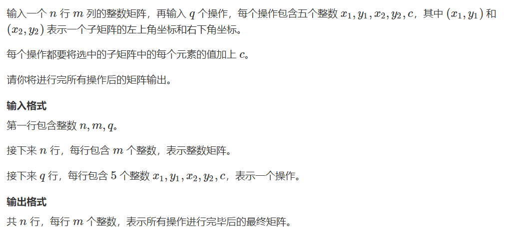 1 #include<iostream> 2 using namespace std; 3 #define ios_base \ 4 ios::sync_with_stdio(false);\ 5 cin.tie(nullptr),cout.tie(nullptr) 6 const int N = 1e3+10; 7 int n,m,q,a[N][N],b[N][N];//b数组是差分数组 8 void insert(int x1,int y1,int x2,int y2,int c)//对差分数组的建立、操作 9 { 10 b[x1][y1]+=c; 11 b[x2+1][y1]-=c; 12 b[x1][y2+1]-=c; 13 b[x2+1][y2+1]+=c; 14 } 15 int main() 16 { 17 ios_base; 18 cin>>n>>m>>q; 19 for (int i = 1; i <= n; i++) 20 { 21 for (int j = 1; j <= m; j++) 22 { 23 cin>>a[i][j]; 24 } 25 } 26 for (int i = 1; i <= n; i++)//开始建立差分数组 27 { 28 for (int j = 1; j <= m; j++) 29 { 30 insert(i,j,i,j,a[i][j]); 31 } 32 } 33 while (q--) 34 { 35 int x1,y1,x2,y2,c; 36 cin>>x1>>y1>>x2>>y2>>c; 37 insert(x1,y1,x2,y2,c);//根据题意,在差分数组上进行插值的操作 38 } 39 for (int i = 1; i <= n; i++)//在差分数组b上直接进行操作:由差分数组复原回原数组 40 { 41 for (int j = 1; j <= m; j++) 42 { 43 b[i][j]+=b[i-1][j]+b[i][j-1]-b[i-1][j-1]; 44 } 45 } 46 for (int i = 1; i <= n; i++) 47 { 48 for (int j = 1; j <= m; j++) 49 { 50 cout<<b[i][j]<<' '; 51 } 52 cout<<'\n'; 53 } 54 55 return 0; 56 }