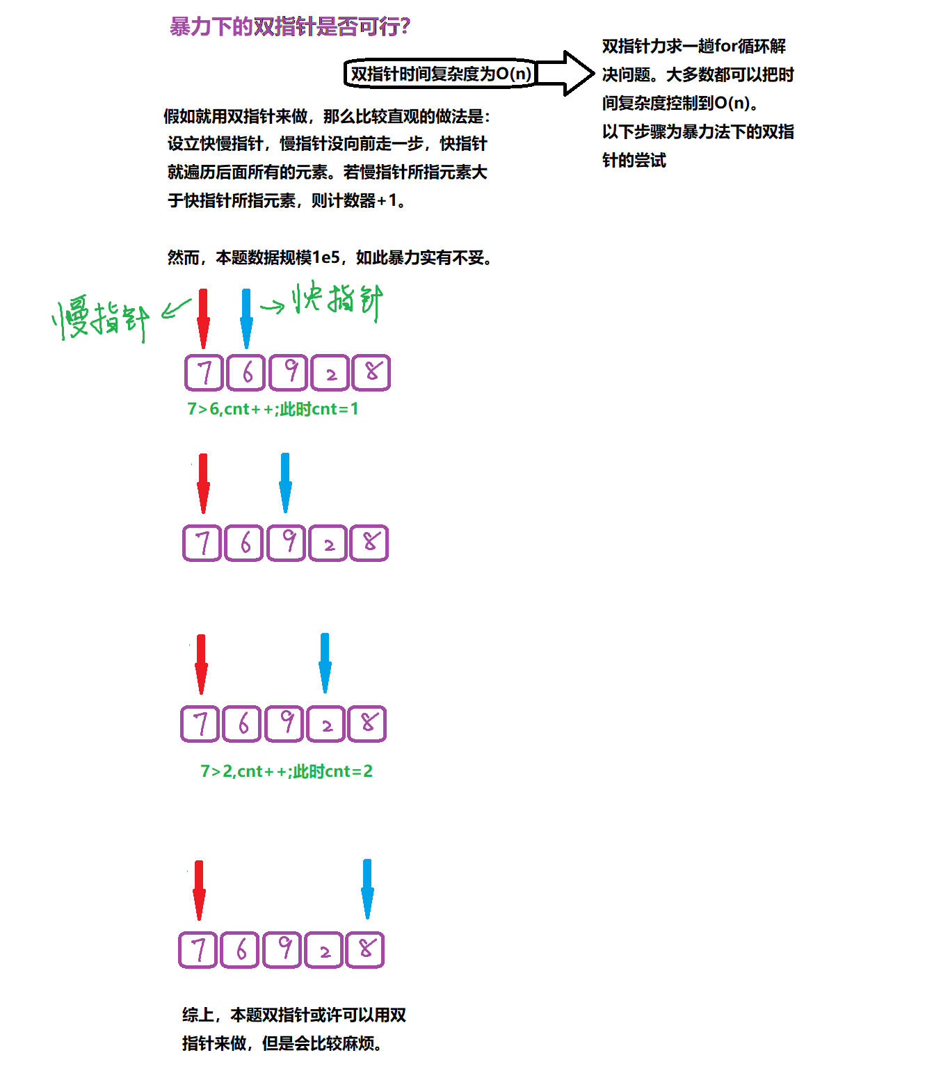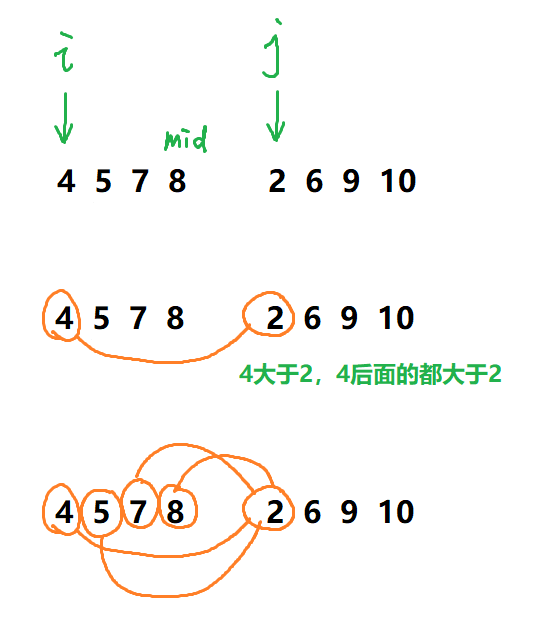 - 归并排序的具体操作中有这样一步:两个指针处理两段区间,谁小就将谁放入临时数组。