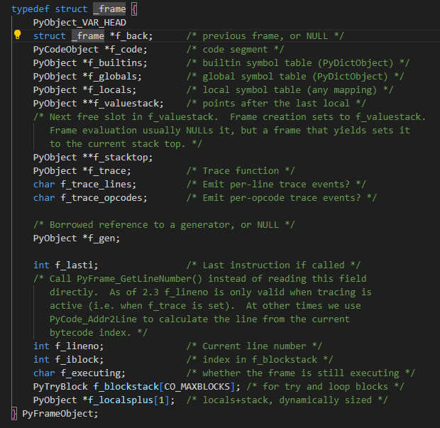 我们知道在C中每运行一个新函数,便会为该函数栈上开辟一个帧,而python中的frame 就是这么一个概念,每一个函数运行都会给他创建一个frame 作为函数的运行环境