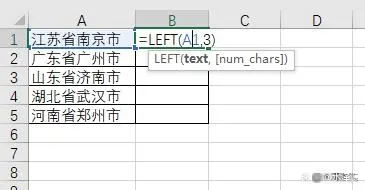 在B1单元格中输入=LEFT(A1,3),得到的就是“江苏省”,下拉填充即可!