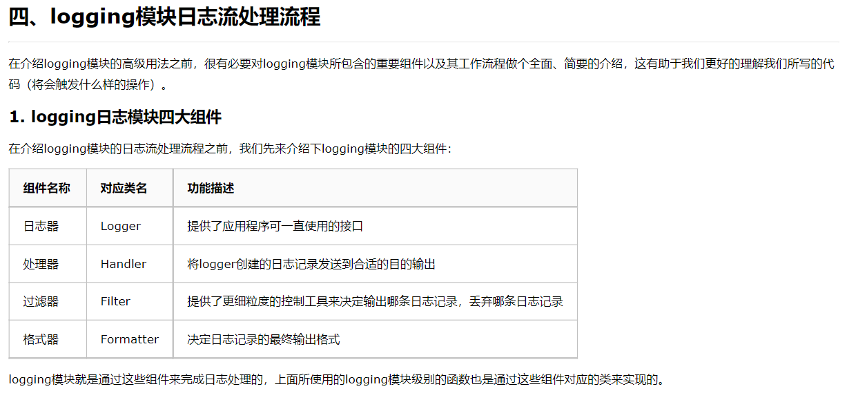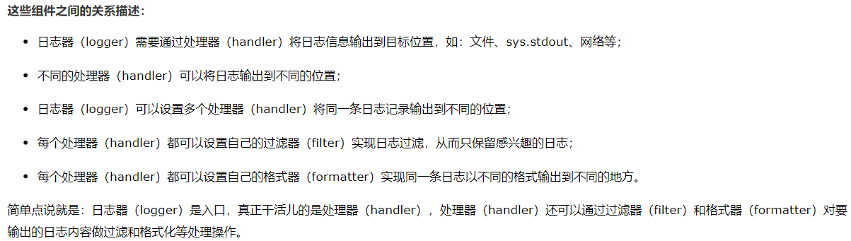 | levelname | %(levelname)s | 该日志记录的文字形式的日志级别('DEBUG', 'INFO', 'WARNING', 'ERROR', 'CRITICAL') |