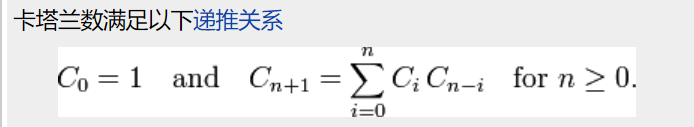 1)Cn=C0Cn-1+C1Cn-2+......+Cn-1C0, C0=1 --->n<=100,一般用于需要输出catalan数的数值 int64