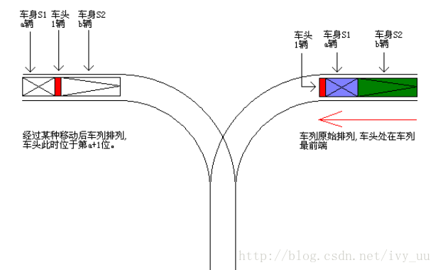 如图,n列火车通过栈,起始车头在车列最前端。经过移动后,车头处在了第a+1位,车头前有a辆车,车头后有b辆车(a>=0,b>=0)。则n=a+b+1,b=n-a-1。