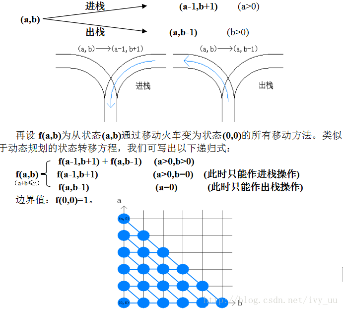 设此时轨道右方,栈,轨道左方的火车数分别为a,b,c。我们就能用(a,b,c)表示出当前的状态。显然n=a+b+c,则c=n-a-b。即已知a和b,c就被确定,所以我们可以用(a,b)来作为状态的表示方法。则起始状态为(n,0),目标状态为(0,0)。又由上面的两种移动方法。我们可类似的得到两种状态转移方式:
