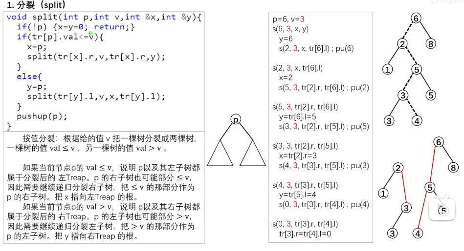 void split(int p,int v,int &x,int &y){ //分裂操作 注意在递归的过程中,连接了分裂后的新边
