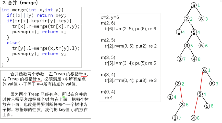 int merg(int x,int y){ //合并,根据key的大小,注意在递归的过程中,连接了分裂后的新边