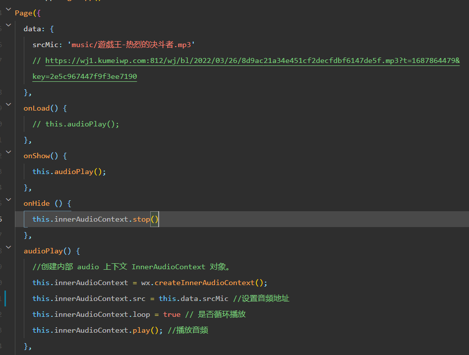//创建内部 audio 上下文 InnerAudioContext 对象。 this.innerAudioContext = wx.createInnerAudioContext(); this.innerAudioContext.src = this.data.srcMic //设置音频地址 this.innerAudioContext.loop = true // 是否循环播放 this.innerAudioContext.play(); //播放音频