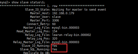//执行前先停下slave stop slave; //这是从库和主库连接的关键一步,host是主库的ip,user是前面创建的slave用户,file和pos是主库show master status的信息 change master to master_host='192.168.0.179',master_user='slave',master_password='slave',master_log_file='mysql-bin.000003',master_log_pos=2336; //执行后启动slave start slave;