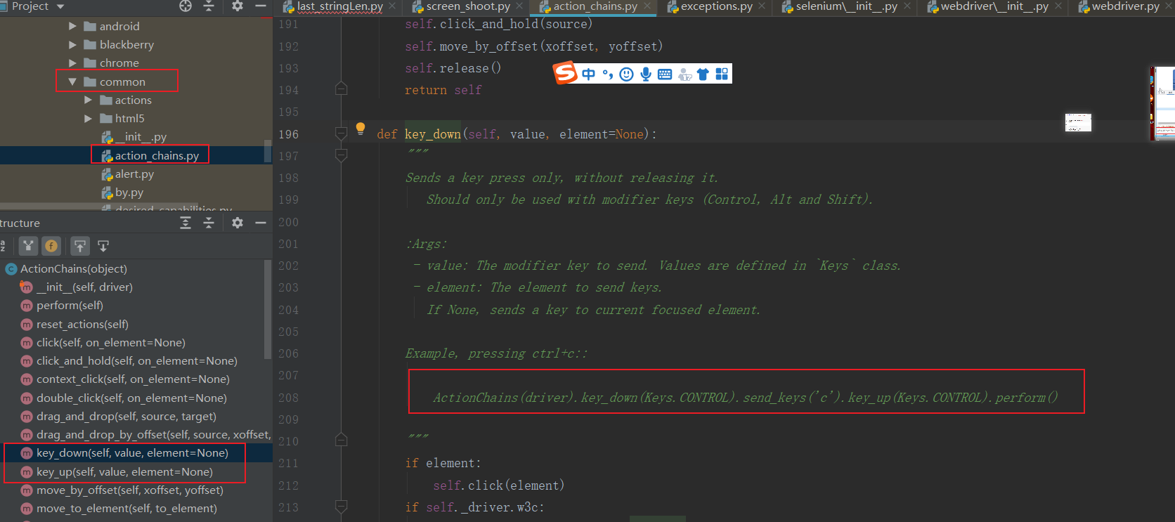 ActionChains(driver).key_down(Keys.CONTROL).send_keys('c').key_up(Keys.CONTROL).perform()