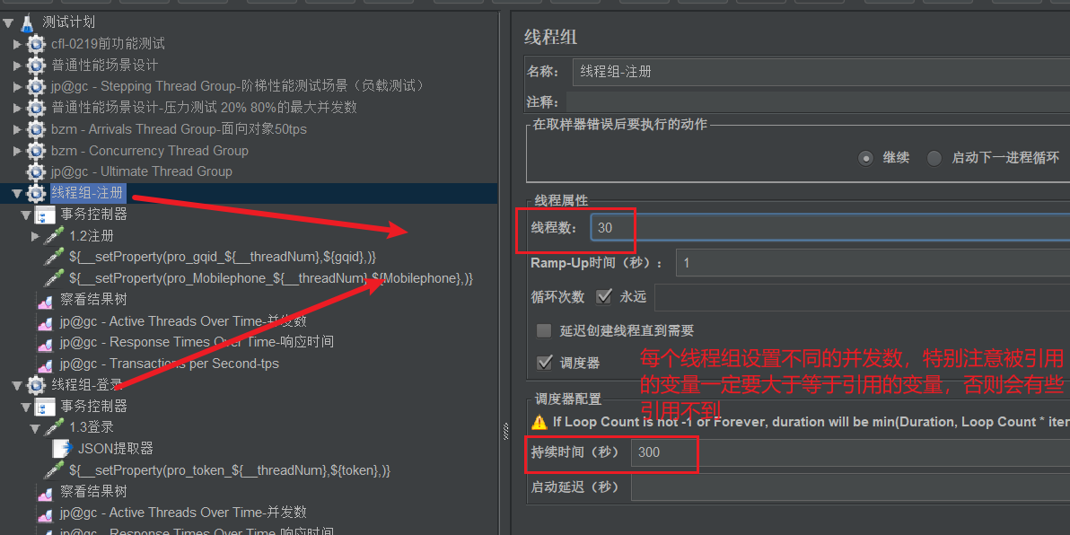 每个线程组设置不同的并发数,特别注意被引用的变量一定要大于等于引用的变量,否则会有些引用不到