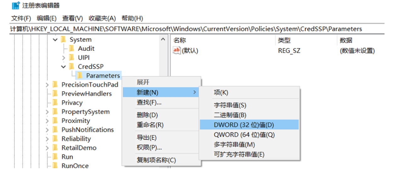 在CredSSP目录下再新建项,重命名为Parameters