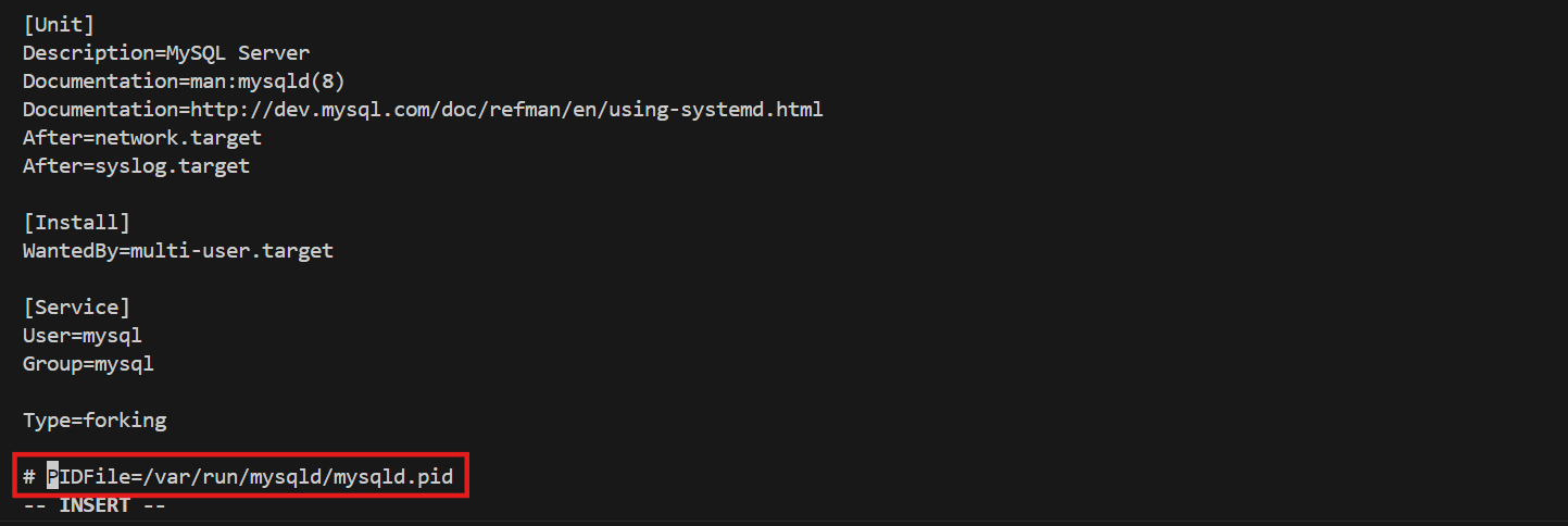 [root@1a6bce4f17af /]# cat /usr/lib/systemd/system/mysqld.service # Copyright (c) 2015, 2023, Oracle and/or its affiliates. # # This program is free software; you can redistribute it and/or modify # it under the terms of the GNU General Public License, version 2.0, # as published by the Free Software Foundation. # # This program is also distributed with certain software (including # but not limited to OpenSSL) that is licensed under separate terms, # as designated in a particular file or component or in included license # documentation. The authors of MySQL hereby grant you an additional # permission to link the program and your derivative works with the # separately licensed software that they have included with MySQL. # # This program is distributed in the hope that it will be useful, # but WITHOUT ANY WARRANTY; without even the implied warranty of # MERCHANTABILITY or FITNESS FOR A PARTICULAR PURPOSE. See the # GNU General Public License, version 2.0, for more details. # # You should have received a copy of the GNU General Public License # along with this program; if not, write to the Free Software # Foundation, Inc., 51 Franklin St, Fifth Floor, Boston, MA 02110-1301 USA # # systemd service file for MySQL forking server # [Unit] Description=MySQL Server Documentation=man:mysqld(8) Documentation=http://dev.mysql.com/doc/refman/en/using-systemd.html After=network.target After=syslog.target [Install] WantedBy=multi-user.target [Service] User=mysql Group=mysql Type=forking PIDFile=/var/run/mysqld/mysqld.pid # Disable service start and stop timeout logic of systemd for mysqld service. TimeoutSec=0 # Execute pre and post scripts as root PermissionsStartOnly=true # Needed to create system tables ExecStartPre=/usr/bin/mysqld_pre_systemd # Start main service ExecStart=/usr/sbin/mysqld --daemonize --pid-file=/var/run/mysqld/mysqld.pid $MYSQLD_OPTS # Use this to switch malloc implementation EnvironmentFile=-/etc/sysconfig/mysql # Sets open_files_limit LimitNOFILE = 5000 Restart=on-failure RestartPreventExitStatus=1 PrivateTmp=false
