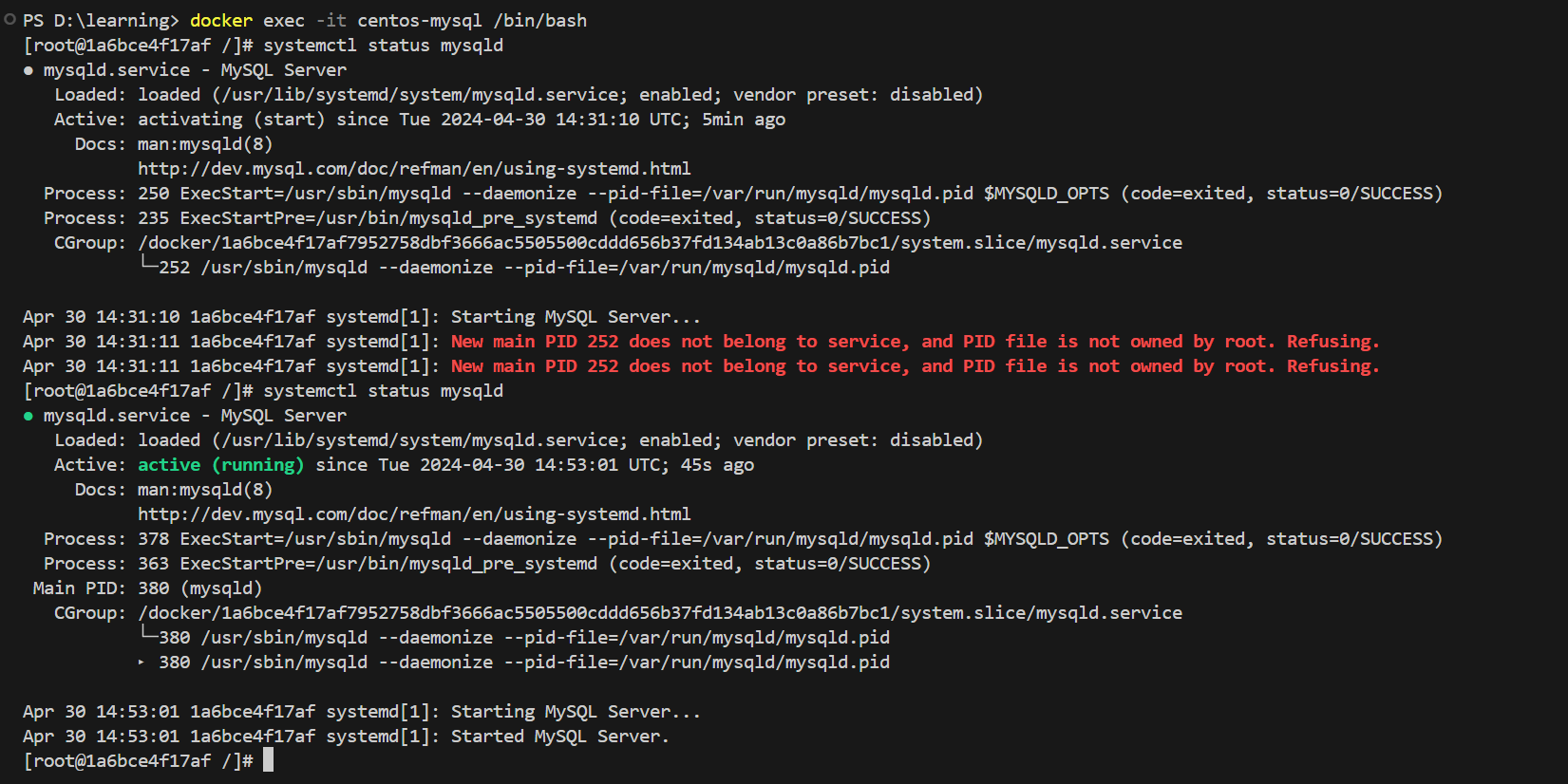 [root@1a6bce4f17af /]# systemctl status mysqld ● mysqld.service - MySQL Server Loaded: loaded (/usr/lib/systemd/system/mysqld.service; enabled; vendor preset: disabled) Active: activating (start) since Tue 2024-04-30 14:31:10 UTC; 5min ago Docs: man:mysqld(8) http://dev.mysql.com/doc/refman/en/using-systemd.html Process: 250 ExecStart=/usr/sbin/mysqld --daemonize --pid-file=/var/run/mysqld/mysqld.pid $MYSQLD_OPTS (code=exited, status=0/SUCCESS) Process: 235 ExecStartPre=/usr/bin/mysqld_pre_systemd (code=exited, status=0/SUCCESS) CGroup: /docker/1a6bce4f17af7952758dbf3666ac5505500cddd656b37fd134ab13c0a86b7bc1/system.slice/mysqld.service └─252 /usr/sbin/mysqld --daemonize --pid-file=/var/run/mysqld/mysqld.pid Apr 30 14:31:10 1a6bce4f17af systemd[1]: Starting MySQL Server... Apr 30 14:31:11 1a6bce4f17af systemd[1]: New main PID 252 does not belong to service, and PID file is not owned by root. Refusing. Apr 30 14:31:11 1a6bce4f17af systemd[1]: New main PID 252 does not belong to service, and PID file is not owned by root. Refusing.