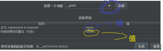 (5) 在右上角倒数第三个函数助手中生成一个函数,选择jexl3,填写对应的键值