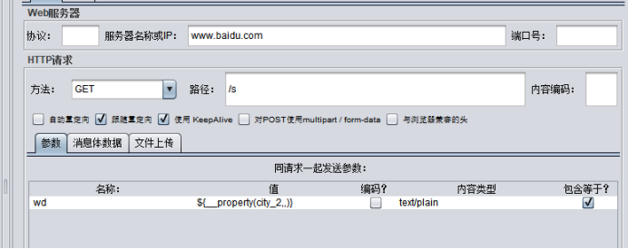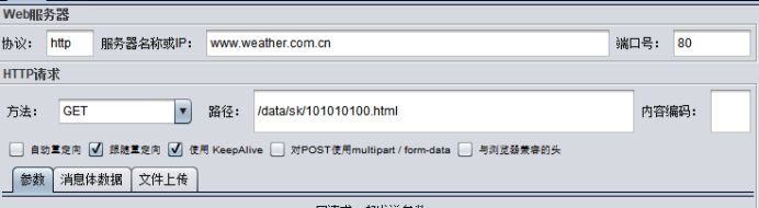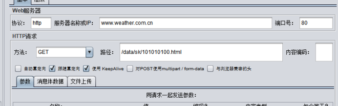 (2) 在该线程组下创建一个http请求,填写要访问的服务器,这里举例获取城市天气