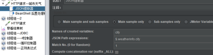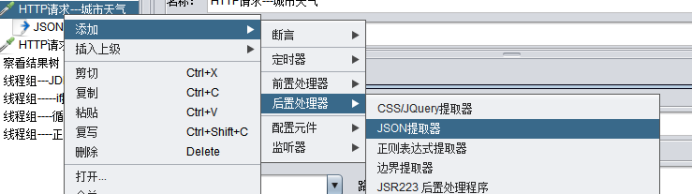 (3) 在该http请求下创建一个json提取器,用来提取请求天气后服务器的相应数据(json格式的天气)