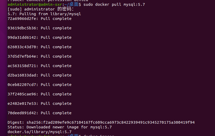 方法一:需要使用sudo docker pull mysql:5.7 成功