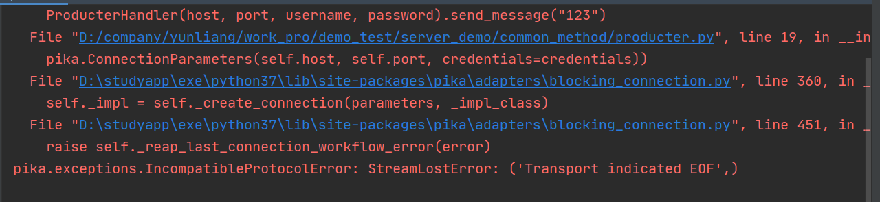 rabbitmq:pika.exceptions.IncompatibleProtocolError: StreamLostError: ('Transport indicated EOF',)