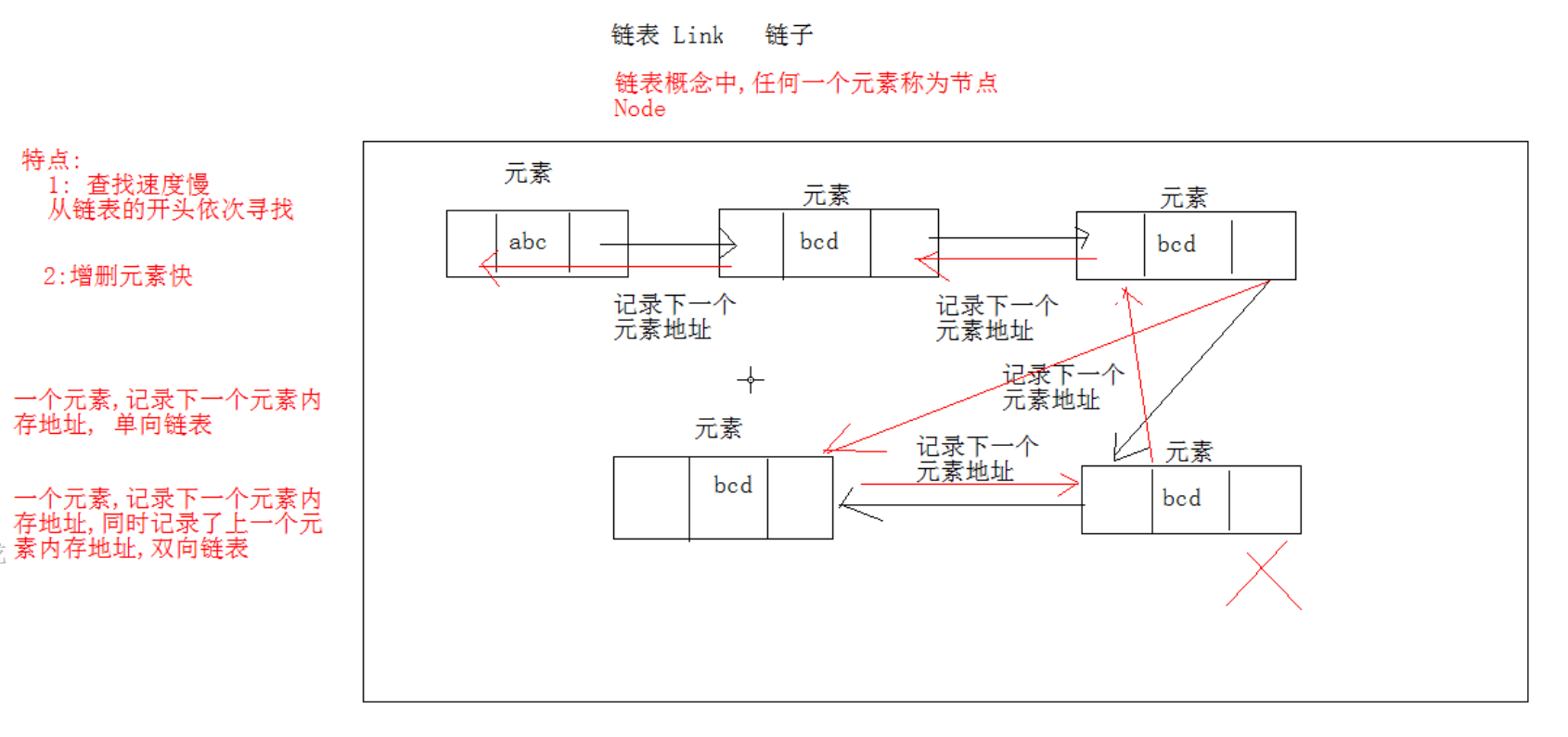 一个元素记录了下一个元素的内存地址,同时记录了上一个元素的内存地址,称为双向链表。)】
