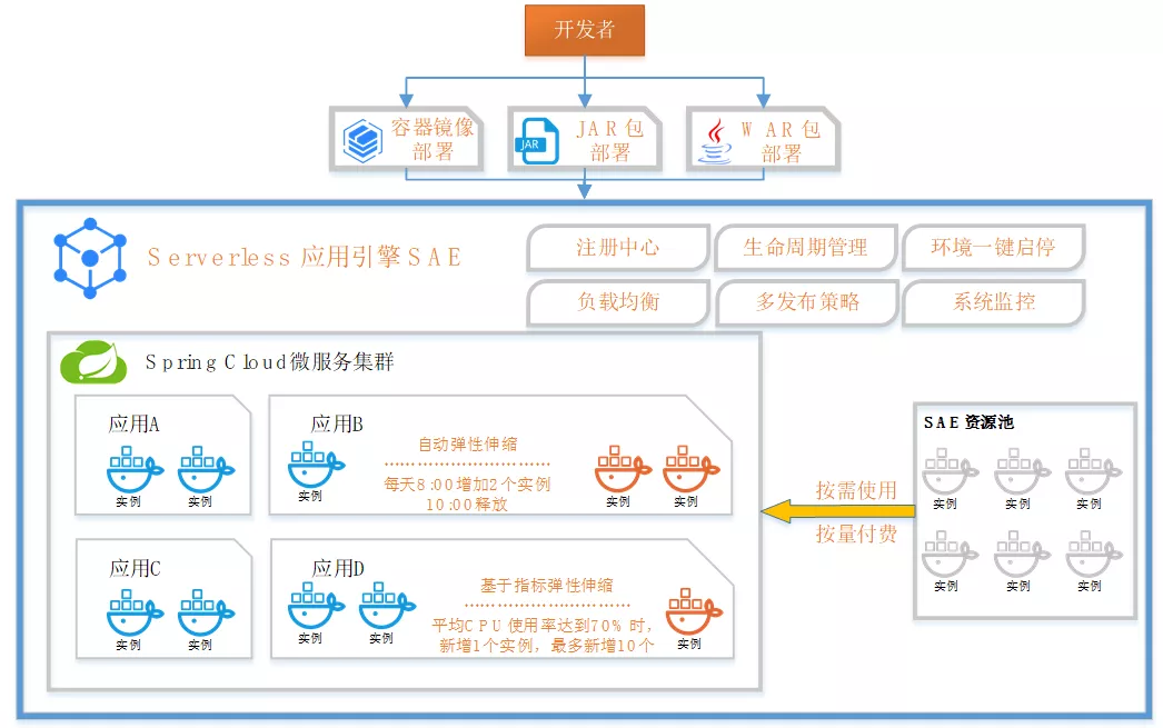 完整的应用生命周期管理:应用托管至 SAE 后,可以对应用执行更新、扩缩容、启停、删除、监控启停等应用生命周期管理操作。