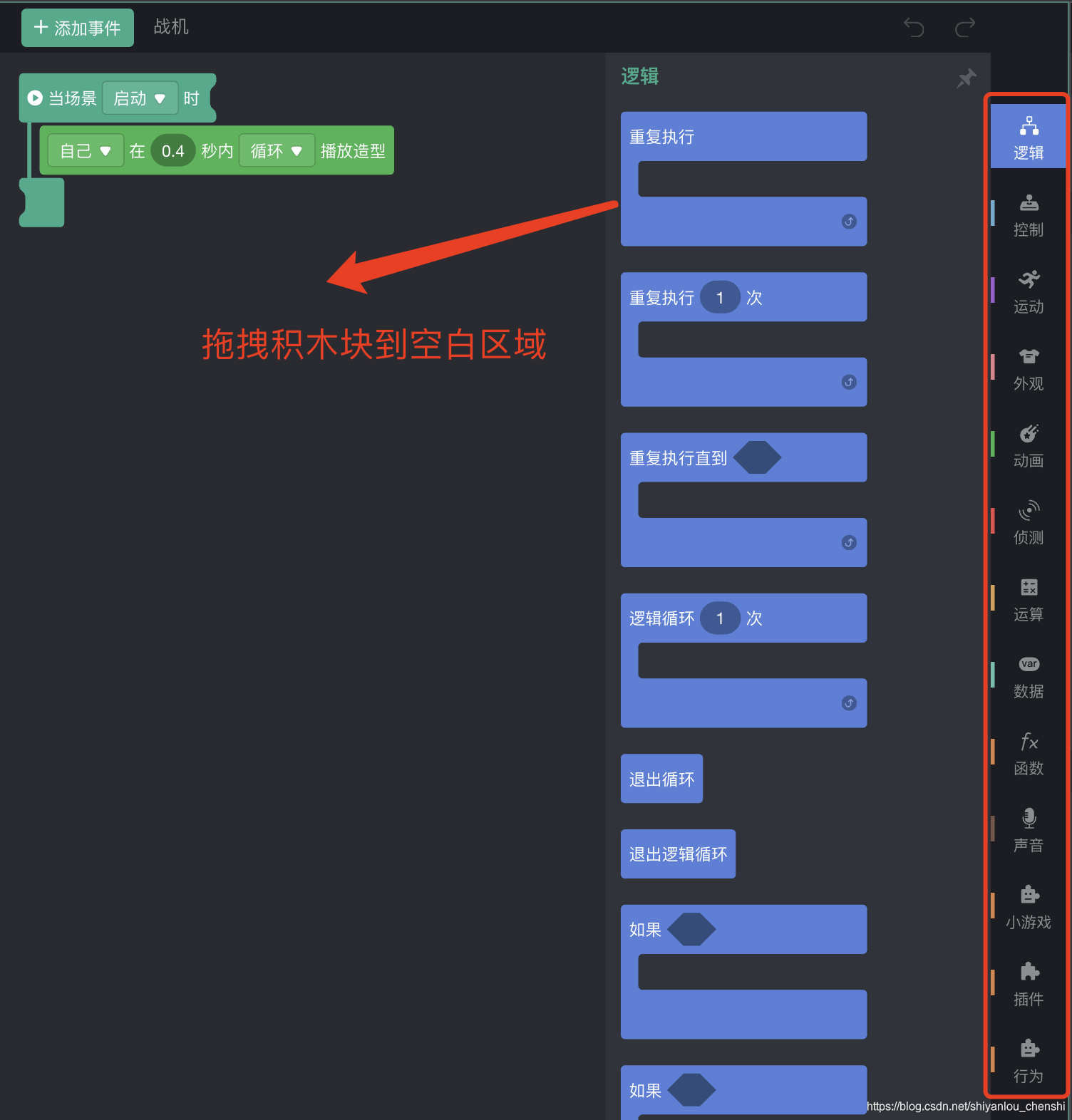 积木区是我们实现游戏逻辑的地方,在这里我们将会使用搭积木的方式,搭建出我们的游戏逻辑。