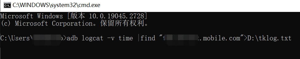 cmd--->adb logcat -v time | find "包名">D:xx.txt 执行后,操作该包对应功能,ctrl+C 终止记录日志信息