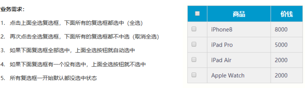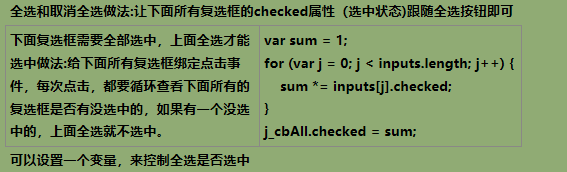 // 2. 下面复选框需要全部选中, 上面全选才能选中做法: 给下面所有复选框绑定点击事件,每次点击,都要循环查看下面所有的复选框是否有没选中的,如果有一个没选中的, 上面全选就不选中。