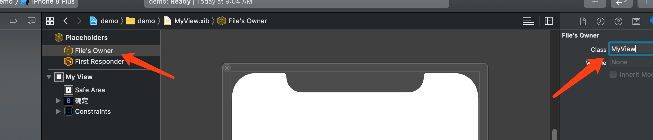 3.这也是最关键的一步,就是设置xib中的File’s owner = MyView, 拖拽view 到关联的代码中命名为contentView.