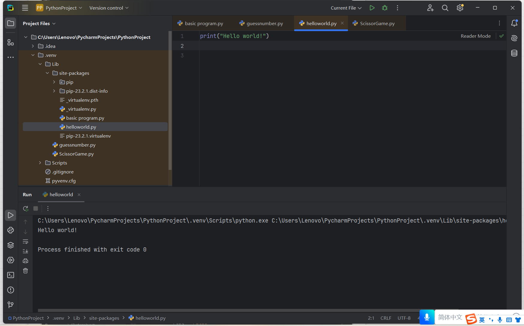 打开Pycharm熟悉运行方式,例如“new"新建文件,点击工具栏绿色三角运行代码(其中Shift+10为快捷键)。