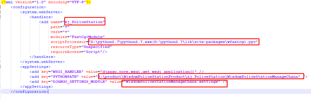 留意:这里面我标记的三个地方,我们需要修改。1、替换为我们之前我们启动wfastcgi时复制的python和wfastcgi的路径。2、填写我们的项目路径。3、填写settings.py的位置。<django App>修改成我们的settings.py所在目录的目录名即可。