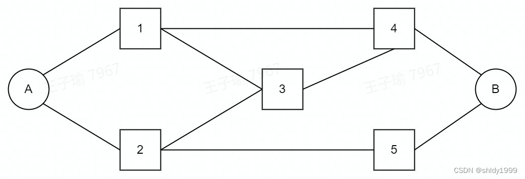 在了解这两者之前我们需要明白数据通过网络传递时一般会有很多条路径可以选择,以A向B传递数据为例,假设有5个路由器1-5,分布如下: