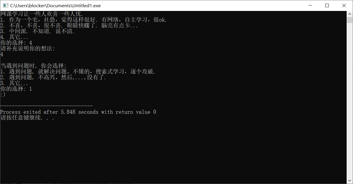 printf("2. 遇到问题, 不高兴。然后,...,没有了.\n");